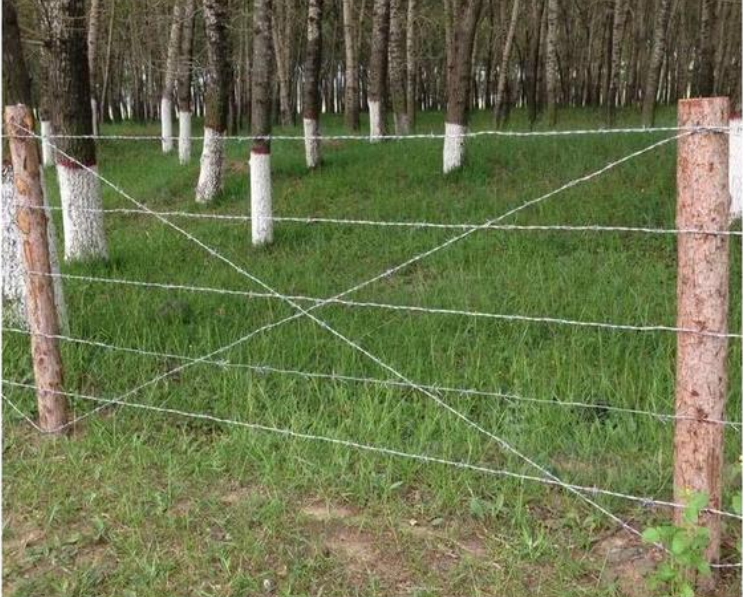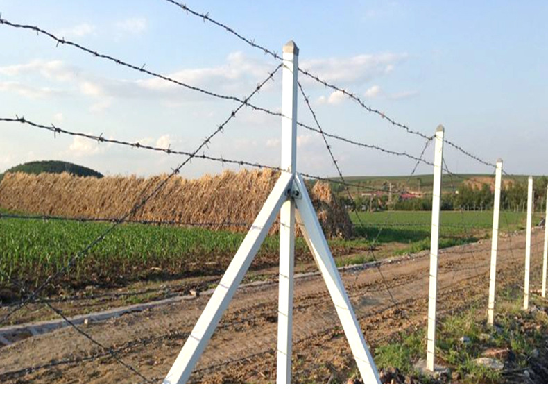 防爬刺丝剌网和立柱搭配使用效果好,每道刺丝刺网之间的间距一般为15- 25公分,高度1.8米,需要9道。农场畜牧业常用的是这种,中间的立柱我们采用方钢或者是圆钢使用。支撑立柱焊接固定钩子,把防扒刺丝剌网固定上面,把勾子拍下去即可。这是常用做法。